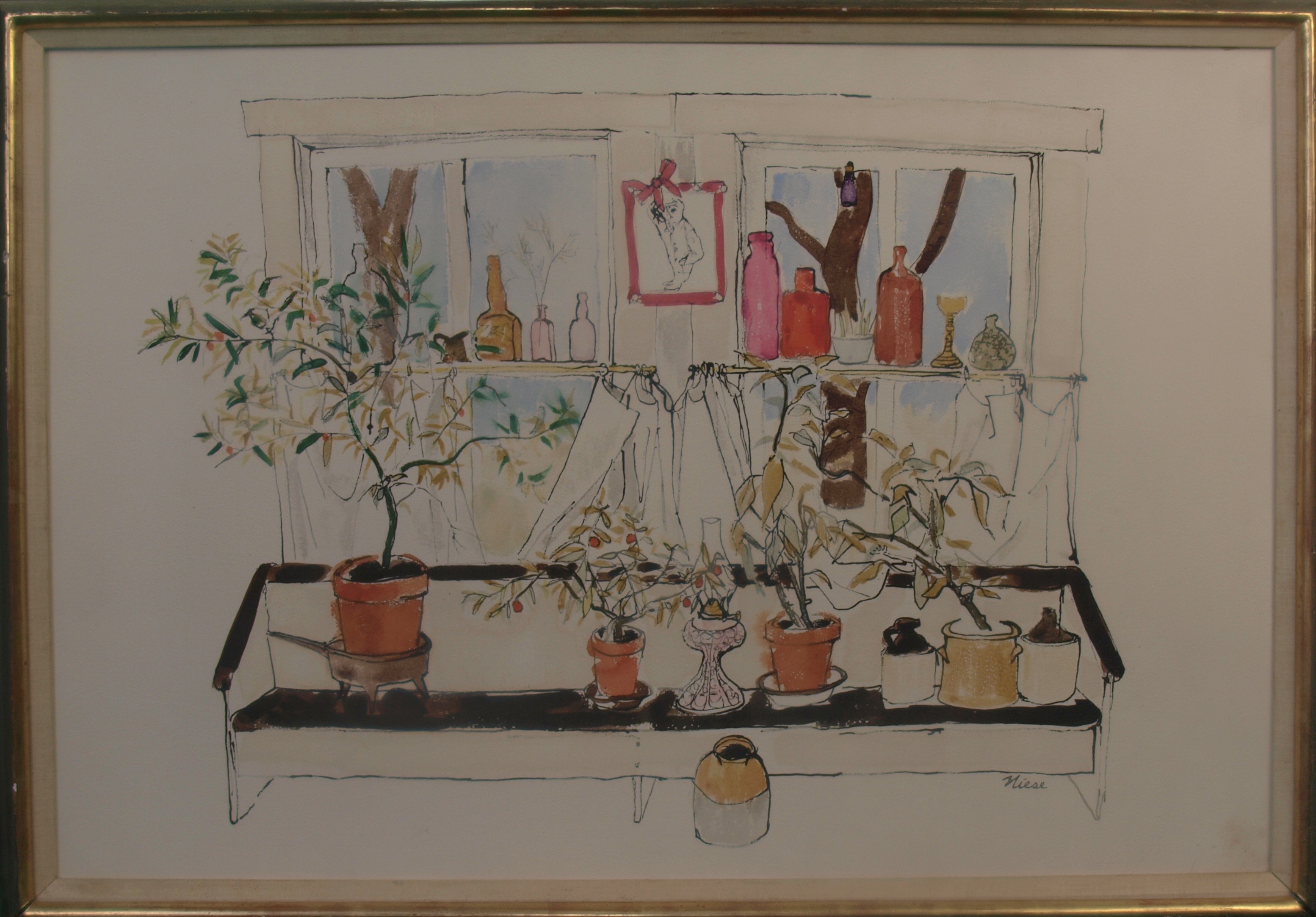 The watercolor was painted by Henry Niese around 1957 in his old farmhouse west of Hackettstown, NJ. It appeared in his 1st or 2nd New York one-man show. The red Venetian bottle in our painting has been interpreted by him in many of his works throughout the years and is shown brightly in his 2010 “Midnight Snow Blues,” as seen on Gold Leaf Studios’ recent press release and invitations.