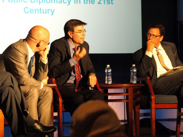 Literary blogger George Clack (center) in expert-consultant mode, explaining it all to Clay Shirky and Frank Sesno at a July 2008 George Washington University conference. (Photo: Tim Brown)