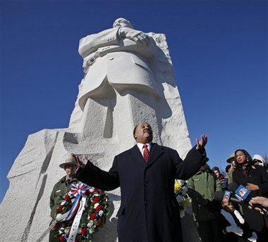 Martin Luther King III (center) speaks at the Martin Luther King, Jr. Memorial in observance of King's 83rd birthday anniversary on January 15, 2012. (Photo: AP)