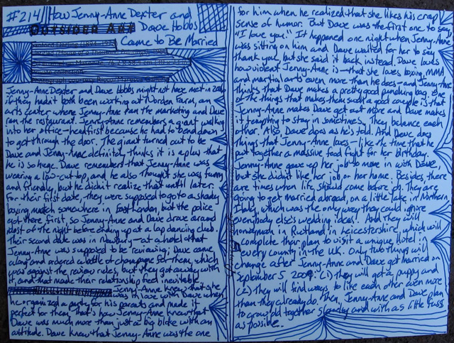 Eventually, I set up a blog, posted a few of the life stories and invited people to get in touch with me if they wanted their story written. I started doing interviews over the telephone and by email. I used a special micro-tipped pen that let me write smaller so that I could fit more words onto each postcard. I asked more questions, and the text got longer and included a lot more detail. It was after I wrote Adam’s story (#45), one of the first that I wrote at home, in private, giving myself as much time and as many words as needed, that the project began to take the form it has today.