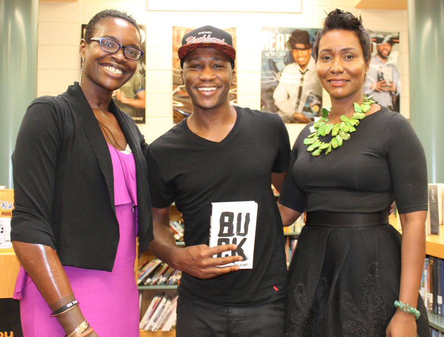 Homewood Center student Dre Fleeks, who had a copy of Buck autographed for him, with the author, M.K. Asante.