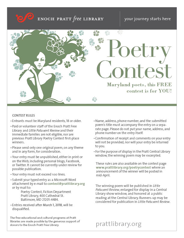 We are also sponsoring a free poetry contest for Maryland residents with the Enoch Pratt Free Library, with a deadline of March 1. The winning poem will be published in Little Patuxent Review, displayed in a Central Library window, and honored at a reading at the Central Library. Runners-up may also be considered for publication. More information is available on the Pratt Library website and by clicking the image in this post.