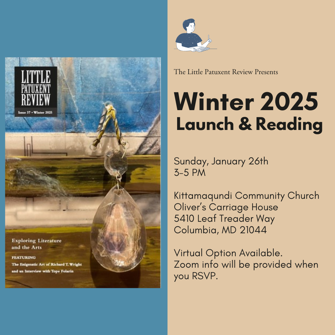 As this issue of Little Patuxent Review is launched, authoritarianism has been ushered right inside. Our democracy in the U.S. is so fragile, so terribly incomplete from its very inception, so tenuous. As a person for whom art lights the way, I hope for the nearly-impossible in the face of anxiety: that we stay as pried-open as we can bear to be; that we keep reading, listening, looking, and identifying each other’s humanity.