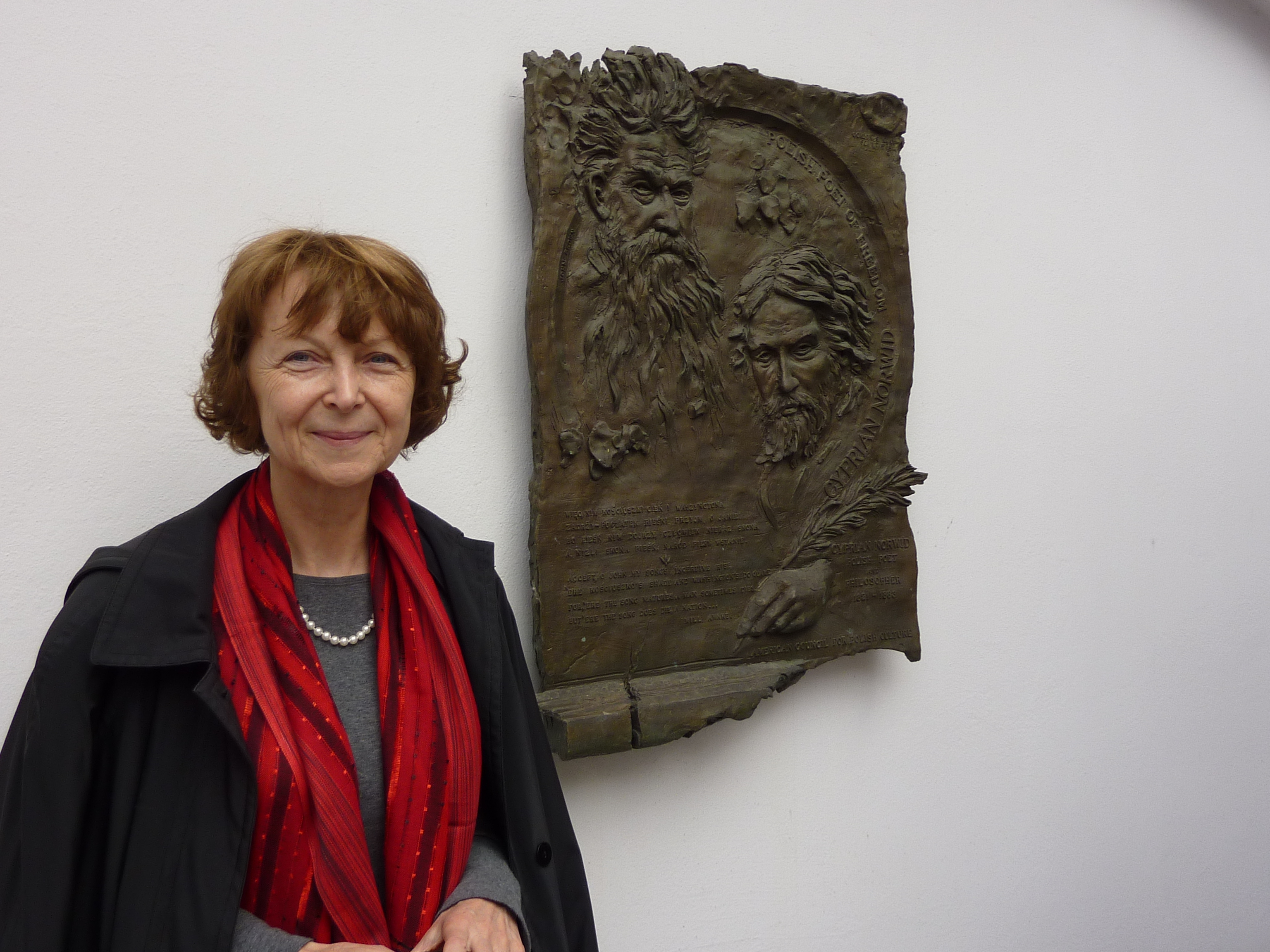 Danuta Kosk-Kosicka standing by the plaque depicting John Brown and Polish poet Kamil Cyprian Norwid